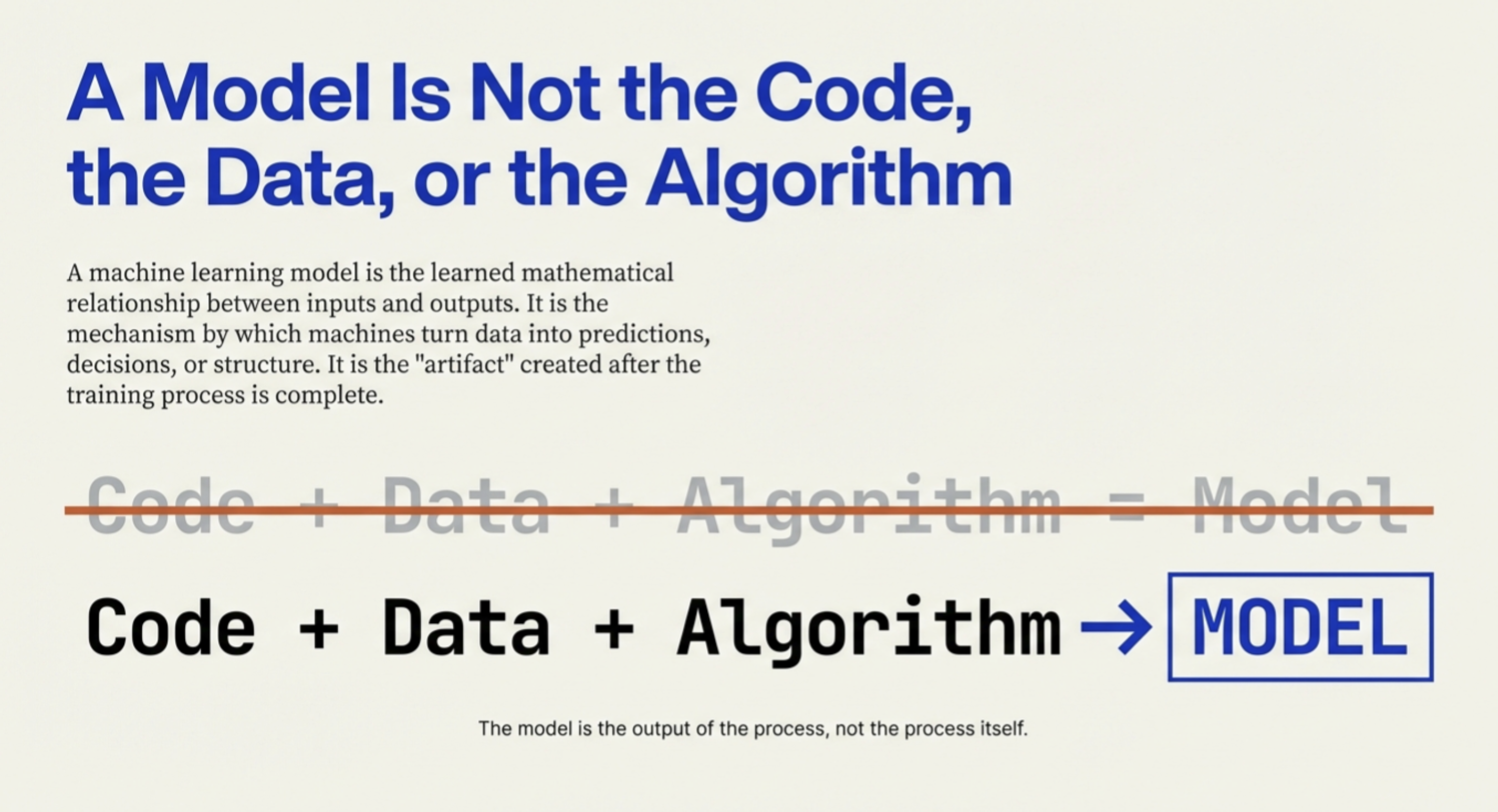 A machine learning model is not simply code, and it is not the dataset itself. It is not even the algorithm. Instead, a model is the learned mathematical relationship between inputs and outputs, the mechanism by which machines turn data into predictions, decisions, or structure.