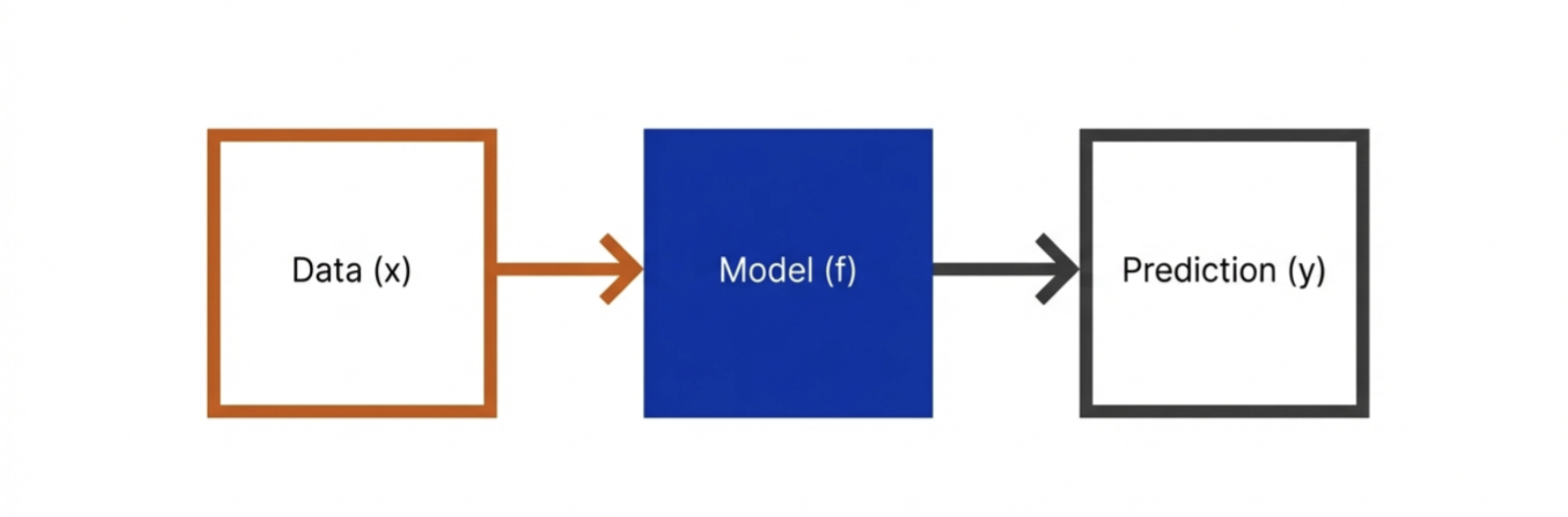 Input data goes in, prediction comes out, and business action follows.