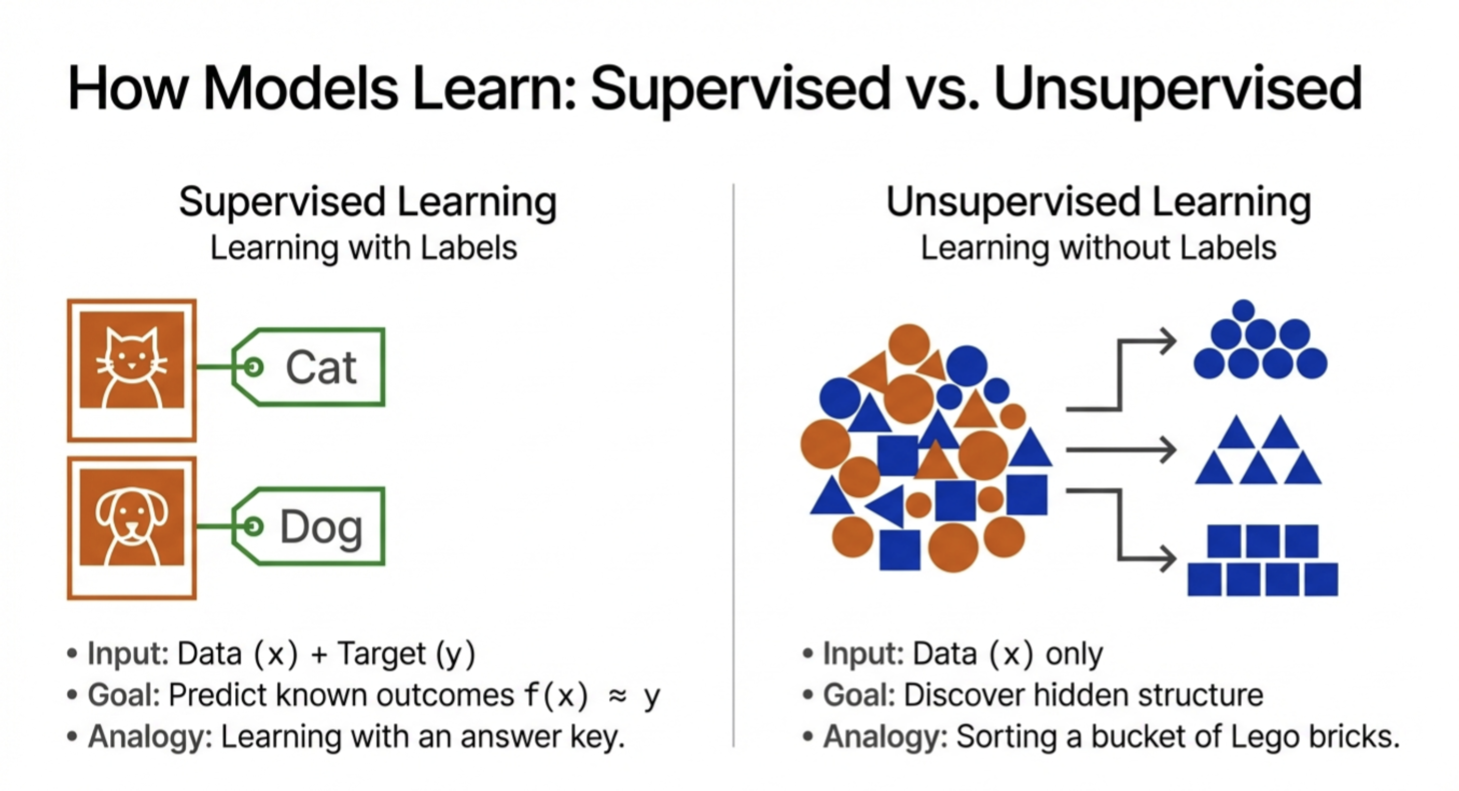 The model learns the function f(x) by finding patterns in these examples.